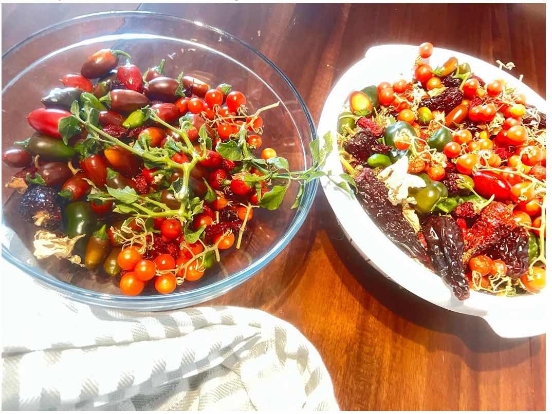 I don’t like super spicy food so I dried them. Then last month, when I was in Phoenix, I gathered all the chili peppers from my son’s inherited garden.